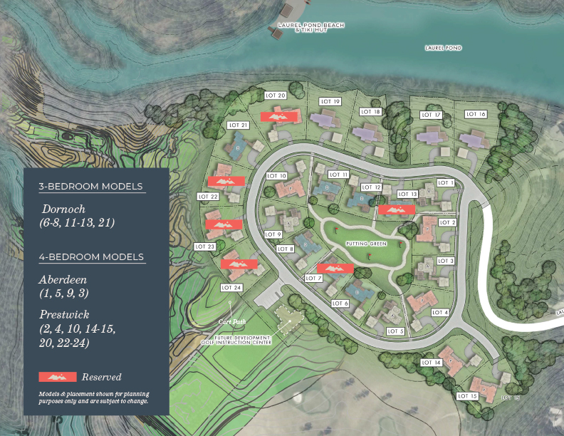 Welcome to Laurel Village, an intimate enclave of 24 three- and four-bedroom, turnkey cottages with generous outdoor entertaining spaces. Private and ideally perched above Laurel Pond, the village encircles a private putting course adjacent to the community’s driving range, planned short course, and state-of-the-art golf performance center. It’s also a short cart ride from the heart of the community’s most vibrant hubs of activity, including the Orchard House, village, marina, and pool.